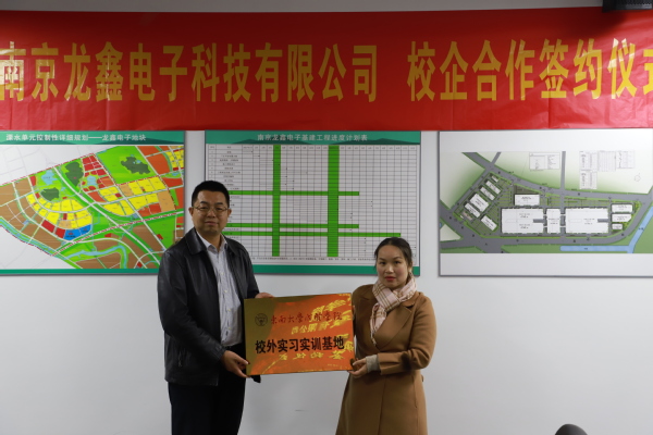 1月10日上午,机械与电气工程学院副院长李永梅一行三人赴南京溧水龙鑫科技有限公司举办校企合作签约暨“校外实习实训基地”授牌仪式。龙鑫科技有限公司副总经理朱风华,人事经理王超然热情接待并陪同参观。