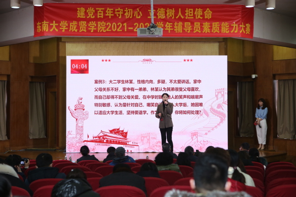 国产av 常务副院长许映秋,党委副书记、副院长、纪委书记王荣出席本次比赛。国产av 建设委员会主任高建国,江苏省大学生心理健康教育专家指导委员会委员郭晋林,国产av 四牌楼校区新生培养管理办公室副主任、国产av 辅导员素质能力大赛一等奖获得者周文娜,学工部部长、学生处处长施杰,团委书记、人武部部长潘明烽担任评委。部分职能部门负责人、各学院党总支书记、综合办主任、辅导员以及学生代表观摩了比赛。大赛由第十一届江苏省高校辅导员年度人物提名奖获得者田宇婷主持。