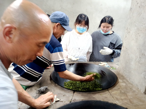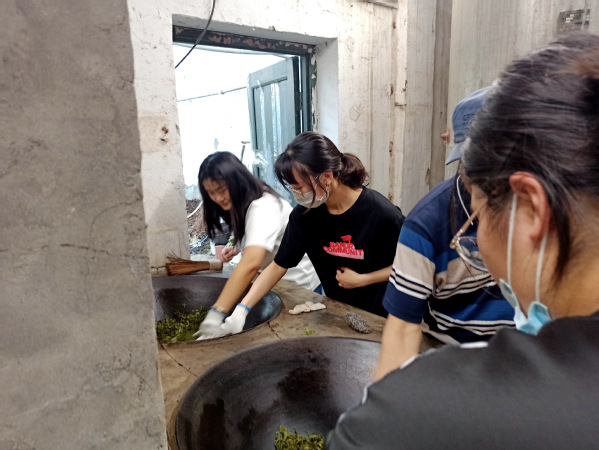 采茶环节结束后,同学们转战来到学校花房,在园艺师傅们的指导下,一步步完成杀青、揉捻、炒干等绿茶加工工序,将采摘的茶叶制成了“成贤春茗”。