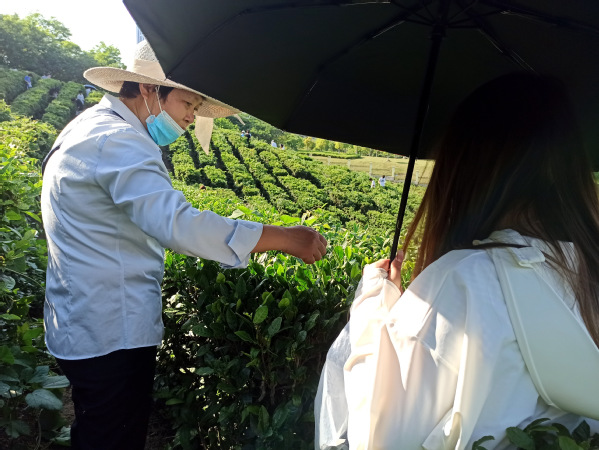 公益活动小组同学指导第一次采茶同学如何寻找嫩芽