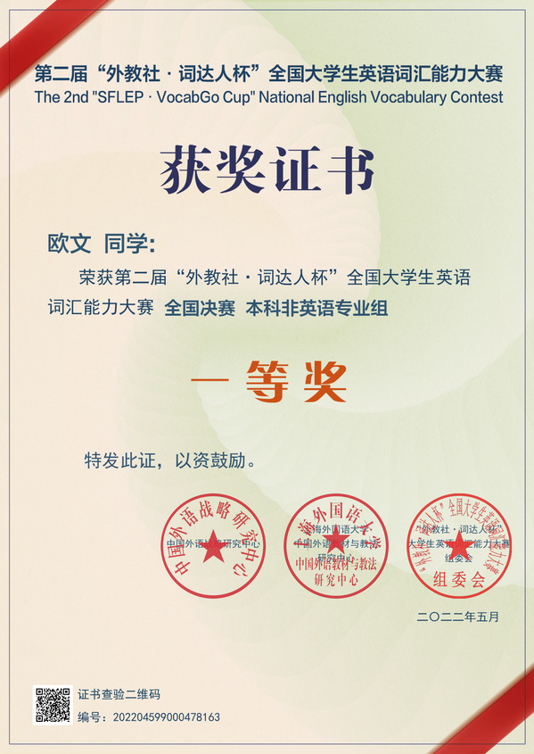 近日,2022“外教社•词达人杯”全国大学生英语词汇大赛(本科非英语专业组)结果公布。国产av 获得全国优秀组织奖(共10所),21级电子信息2班欧文同学(指导老师:基础部周爱萍)经过校赛、省赛的层层选拔,在国赛中脱颖而出,荣获国家一等奖。在本科非英语专业组全国众多参赛院校中,国产av 排名第47位,在全国同类院校中名列前茅,打破了国产av 以往在该项竞赛中的最高获奖纪录。