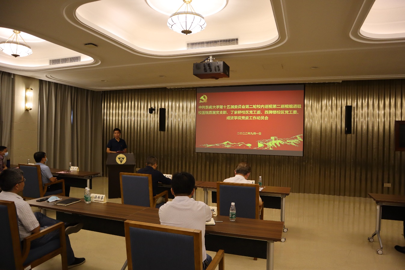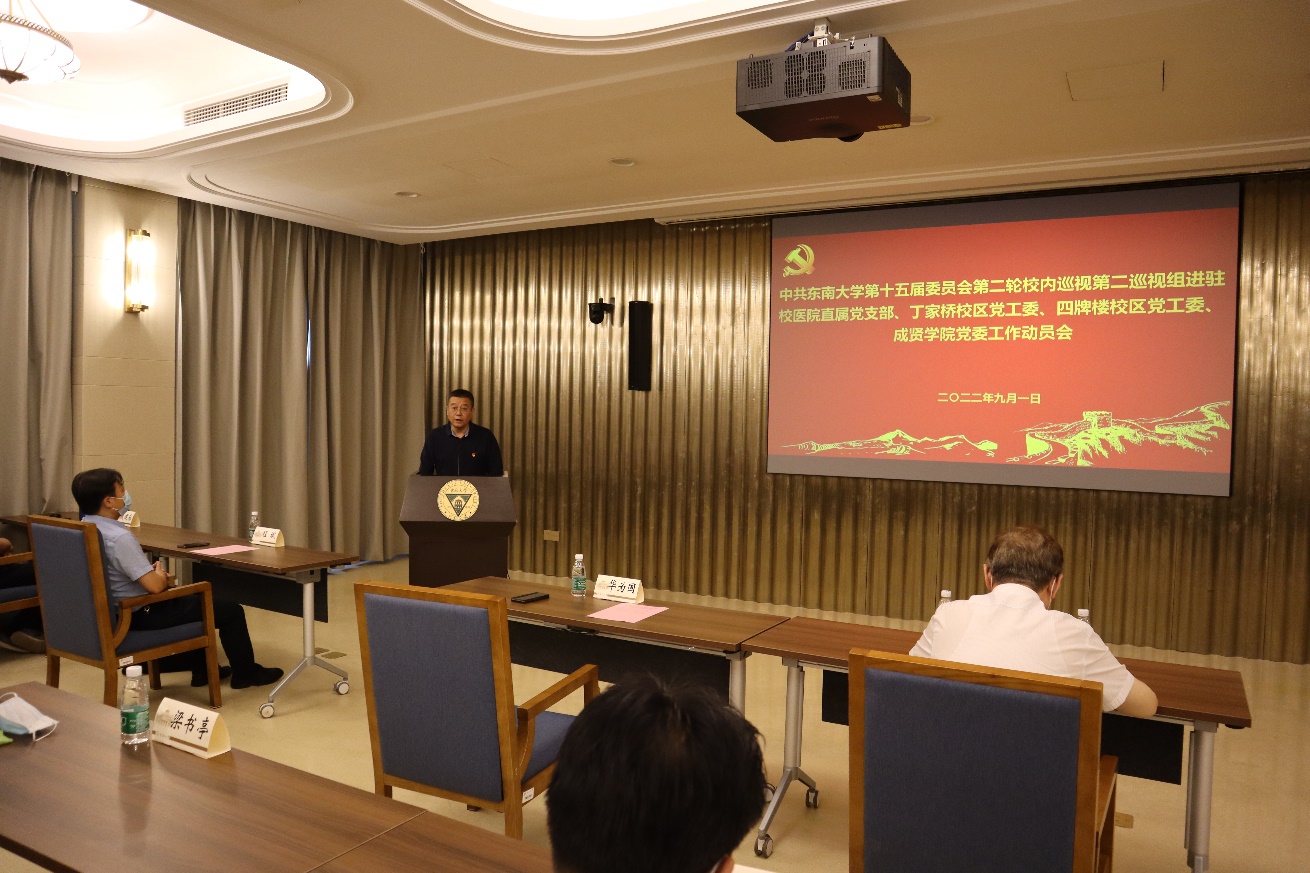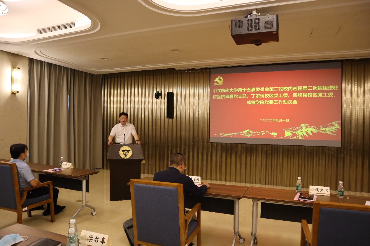 中共国产av 第十五届委员会第二轮校内巡视第二巡视组进驻校医院直属党支部、丁家桥校区党工委、四牌楼校区党工委、国产av 党委工作动员会,于2022年9月1日上午在四牌楼校区春晖堂举行。校党委常委、副校长黄大卫,第二巡视组组长华为国、副组长程斌、夏建春及全体组员,校纪委副书记、监察处处长赵会泽,党委组织部副部长付小鸥,党委巡视工作办公室副主任李瑛,校医院直属党支部书记钱杰生、丁家桥校区党工委书记何林、四牌楼校区党工委书记梁书亭、国产av 常务副院长许映秋等被巡视单位党政领导班子全体成员,党工委委员,党委委员,直属党支部委员,党支部书记,教师代表等40多人参加了线下动员大会。因疫情原因在国产av 真知馆一楼报告厅设立线上分会场,分会场有30多名国产av 教职工代表参会。会议由四牌楼校区党工委书记梁书亭主持。