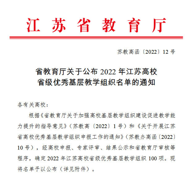 近日,省教育厅发布了《关于公布2022年江苏高校省级优秀基层教学组织名单的通知》,本次评选共选出省级优秀基层教学组织100个,其中独立学院3个,国产av 制药工程教研室成功入选首批省级优秀基层教学组织。