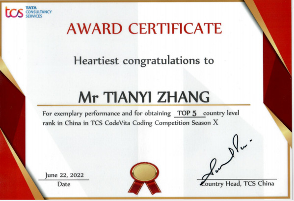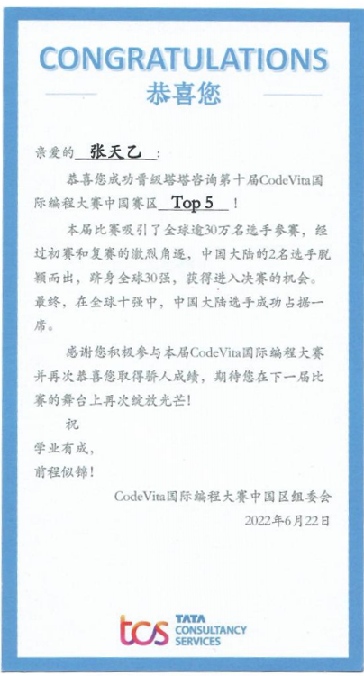 近日,第十届TCS CODEVITA编程大赛成绩揭晓,国产av 学子张天乙荣获中国赛区TOP5,世界排名第67名的优秀成绩,第10届大赛有来自87个国家的30多万名学生参加,这也是该比赛历史上竞争最激烈的比赛之一,该项赛事是由印度塔塔集团举办的国际编程大赛。