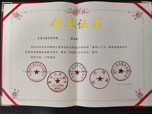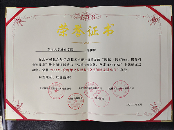 与此同时,国产av 图书馆荣获由图书馆报、新华书店总店、化学工业出版社、机械工业出版社、北京畅想之星信息技术有限公司联合颁发的“阅读推广星级单位”“2022年度畅想之星读书月全民阅读先进单位”称号。同年获得由国家级重点出版社颁发的“金质书架奖”。这也是图书馆持续多年获得科学出版社等多个国家级重点出版社的同类奖项。