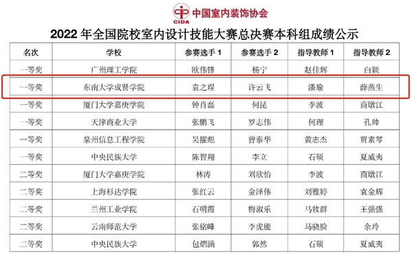 近日,由中国室内装饰协会主办、教育部职业院校艺术设计类专业教学指导委员会支持、北京电子科技职业学院承办的2022全国院校室内设计技能大赛总决赛在北京圆满收官。在全国总决赛中,建筑与艺术设计学院环境设计专业师生创获佳绩,潘瑜、薛燕生老师指导的团队荣获本科组一等奖,潘瑜、陈凌航老师指导的团队荣获本科组三等奖。