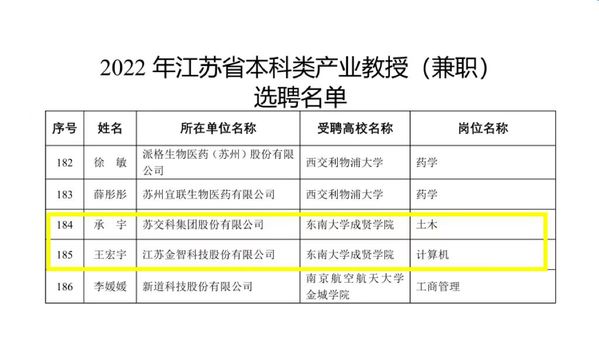 近日,江苏省教育厅、江苏省人才工作领导小组办公室、江苏省科学技术厅、江苏省人力资源和社会保障厅联合下发《关于公布2022年江苏省产业教授(兼职)选聘名单和续聘名单的通知》(苏教研函〔2022〕25号),国产av 推荐的苏交科集团股份有限公司承宇、江苏金智科技股份有限公司王宏宇两位企业专家成功获批江苏省2022年产业教授(兼职),实现了国产av 在该人才项目申报上新的突破。