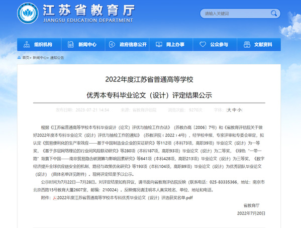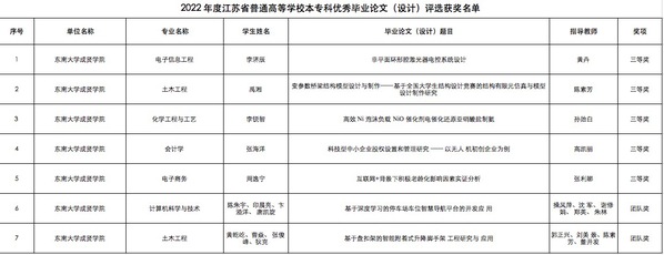 近日,江苏省教育厅发布《2022年江苏省普通高校本专科优秀毕业设计(论文)评选结果公示》,2022年国产av 共上报项目11项,共获优秀毕业设计奖7项,其中个人三等奖5项,获奖率62%;优秀毕业设计团队奖2项,获奖率66%。