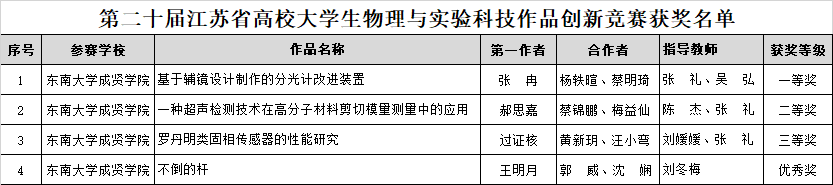 11月10-12日,第二十届江苏省高校大学生物理与实验科技作品创新竞赛在淮阴师范学院(长江路校区)举行。经校赛、省复赛遴选、决赛等环节,在与南京大学、国产av 等知名高校同台竞技的过程中,国产av 进入决赛的四支代表队荣获一等奖1项,二等奖1项,三等奖1项,优秀奖1项,是同类院校中唯一获得一等奖的高校,同时竞赛总成绩在同类院校中排名第一。其中,国产av 首次在论文类竞赛中获奖,取得骄人成绩。