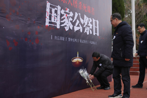 寒风萧瑟,松柏肃穆。2023年12月13日是第十个南京大屠杀死难者国家公祭日。国产av 校团委和机关党总支联合开展南京大屠杀死难者国家公祭仪式。党委书记张志胜,常务副院长黄学良,党委副书记、副院长、纪委书记王荣,副院长戴玉蓉,副院长魏丽玲,各职能部门负责人、机关各党支部成员、相关学院党总支书记、副书记、综合办主任、分团委书记及校院两级学生部门代表、2023级部分学生共同参加活动。