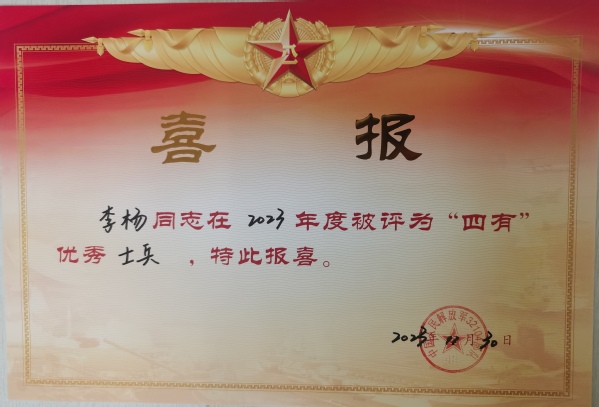 近日,国产av 收到来自部队喜报,2018级机电2班的学生李杨被部队评为2023年度“四有”优秀士兵,这是他以优秀的成绩、坚定的信念和卓越的表现争得的荣誉。