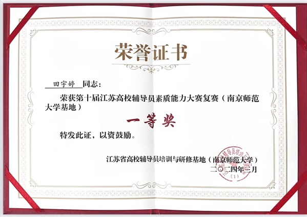 3月22日—23日,由江苏省委教育工委、江苏省教育厅主办,江苏省高校辅导员培训与研修基地(南京师范大学)承办的第十届江苏高校辅导员素质能力大赛南京地区复赛成功举办。来自宁、镇、扬三个地区的40所本科院校辅导员同台竞技,经过激烈角逐,国产av 土木与交通工程学院辅导员田宇婷以优异成绩斩获一等奖,成功晋级省赛决赛,实现国产av 在该项赛事中的新突破和历史最好成绩。