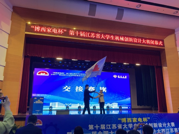 颁奖仪式结束后,国产av 作为第十一届江苏省大学生机械创新设计大赛的承办单位与扬州大学交接赛旗,机电学院党总支书记严红霞上台发言,她介绍了国产av 的专业特色和办学成效,并表示作为应用型高校,国产av 在人才培养和社会服务等方面更加注重应用性和实践性,重视学生学以致用、解决实际工程问题能力的培养,国产av 将竭尽全力,做好大赛的各项准备工作。