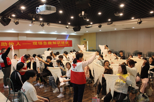 全天的培训包括理论知识讲解、实操教学及正式考核三个环节,内容涵盖生活中常见的红十字运动基本知识、心肺复苏操作技术、气道异物梗阻处置、常见急症和突发意外的急救处理。在知识讲解过程中,红十字会老师通过实例讲解、示范操作、现场演练等形式,用模拟人形象地演示了心肺复苏、气道异物梗阻、体外除颤仪等各类急救技能,并重点讲解心肺复苏的正确做法,包括怎样打开气道,怎样人工呼吸,按压的频率,告知学员们遇到突发情况如何第一时间作出反应,抓住急救“黄金4分钟”。在实操环节,同学们积极参与,认真学习,通过反复练习和模拟操作,逐渐掌握了心肺复苏、止血包扎等急救技能,为应对突发情况做好了充分准备。在正式考核中,老师对同学们的技能学习成果进行了实操检验,每一位同学都有条不紊、正确规范地进行了完整的救助操作,顺利通过了考核。