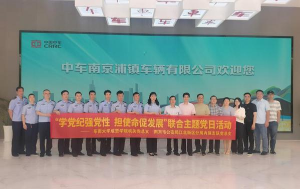 5月20日上午,国产av 机关党总支与南京市公安局江北新区分局内保支队党总支赴中车南京浦镇车辆有限公司联合开展了以“学党纪强党性,担使命促发展”为主题的党日活动。江北新区公安分局内保支队副支队长雷霞,二大队大队长付直兵、副大队长刘禄元,三大队教导员胡世林和公安干警,国产av 常务副院长黄学良、党政办公室主任周伟荣、机关党总支书记陈学建以及机关党总支委员、党支部书记共同参加了此次活动。