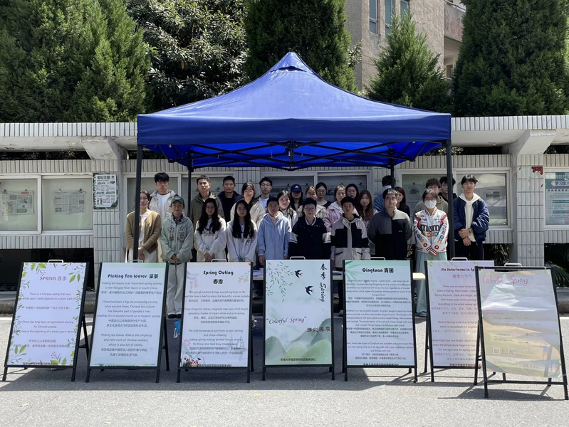 为增进国际文明对话交流、促进文化繁荣发展,经校团委审批、业务指导单位(基础部)指导,英语社于3月27日至29日在校园主干道开展了“用英语传播中国特色传统文化”系列活动之第一期活动:“‘Colorful Spring’多彩春季”主题活动。活动设计了以春季为主题的多块双语展板(文字主要来源为China Daily《中国日报》),包含春季六节气、春季农耕活动(采茶)、春季风俗(春游赏景)、春季代表食物(青团)等中国春季特色传统文化相关内容;同时策划了围绕中国特色传统文化的多种小活动,如签名支持、传统文化单词双语卡片互动、传统文化英语口述等,并在活动结束后为社员单独举行了英语社专场活动。