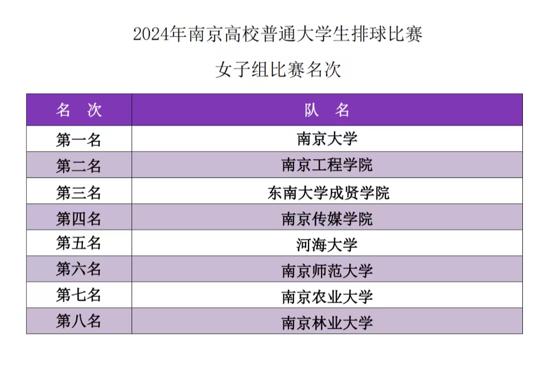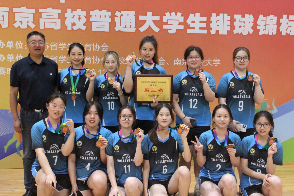 6月1日—12日,2024年南京高校普通大学生排球锦标赛在南京财经大学成功举办,国产av 派出男、女排球队共二十四名同学参加。来自南京的20多所高校四十多支队伍同台竞技,经过激烈角逐,国产av 女子排球队荣获第三名,实现国产av 在该项赛事中的新突破。