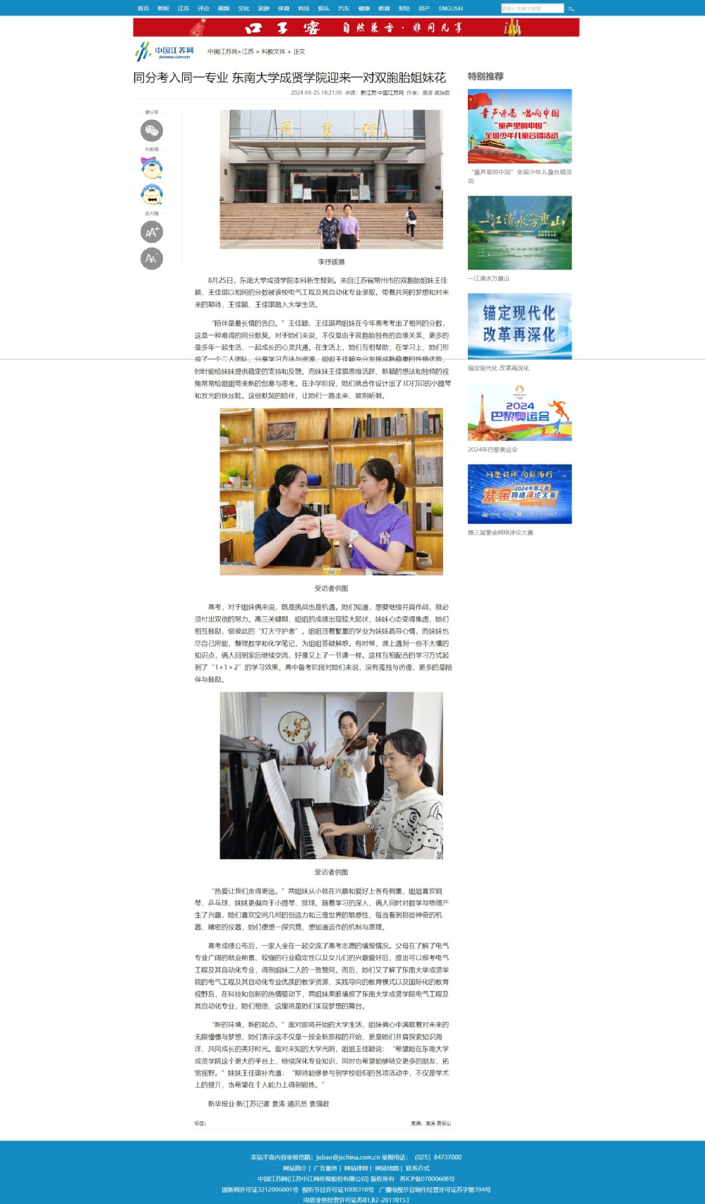 【中国江苏网】同分考入同一专业 国产av 迎来一对双胞胎姐妹花
