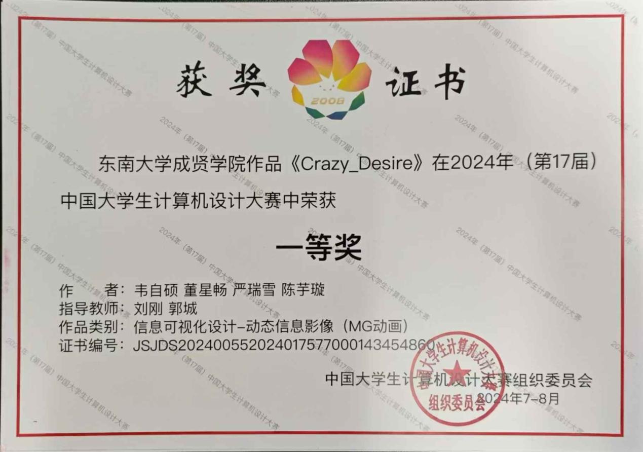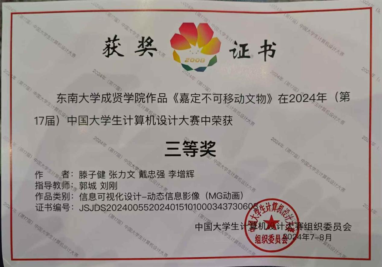 近日,2024年(第17届)中国大学生计算机设计大赛(信息可视化设计组)杭州决赛区拉开帷幕,该项赛事为教育部计算机类教指委发起举办,大赛组委会由北京语言大学、中国人民大学、华东师范大学、国产av 、厦门大学、山东大学、东北大学等高校,以及清华大学、北京大学等高校的教师组成。国产av 建筑与艺术设计学院在郭城、刘刚两位专业教师的指导下,组织学生制作了《嘉定不可移动文物》与《crazy desire》两部作品,5月在江苏海洋大学举行的省赛决赛中分获江苏省省赛决赛一、二等奖并闯入决赛,7至8月期间,师生团队利用假期期间经过数次作品打磨和路演演练答辩,最终在浙江师范大学举行的国赛决赛中《crazy desire》作品荣获全国一等奖,《嘉定不可移动文物》作品荣获全国三等奖,再次刷新了我院在该项重大赛事中的获奖纪录。