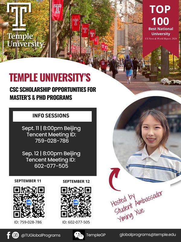 关于美国天普大学硕士项目的CSC奖学金机会线上(腾讯会议)宣讲会的通知