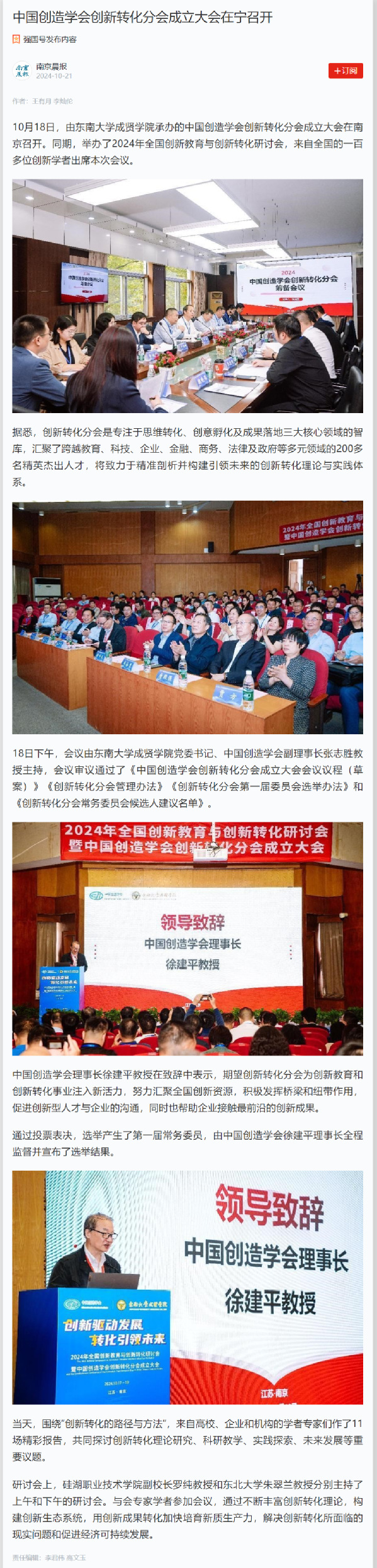 【南京晨报强国号】中国创造学会创新转化分会成立大会在宁召开