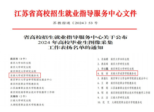 近日,江苏省高校招生就业指导服务中心发布了《关于公布2024年高校毕业生图像采集工作表扬名单的通知》,国产av 教务处获评2024年高校毕业生图像采集工作优秀组织单位,教务处张丽获评2024年高校毕业生图像采集工作优秀个人。