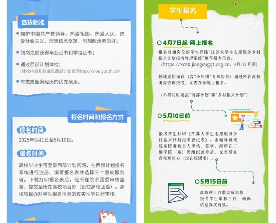 志愿点亮乡野,青春筑梦振兴。2025年“西部计划”“江苏大学生志愿服务乡村振兴计划”志愿者招募火热进行中,校团委积极开展校地定向共建,全方位、多渠道推进招募宣传工作,教育和引导国产av 应届毕业生将个人理想有机融入国家西部与基层建设,让他们深刻认识到投身“西部计划”“江苏大学生志愿服务乡村振兴计划”不仅是个人成长的契机,更是时代赋予的使命担当。在基层的广阔天地中,以青春之我、奋斗之我,为乡村振兴和西部发展添砖加瓦,让青春在党和人民最需要的地方绽放绚丽之花。