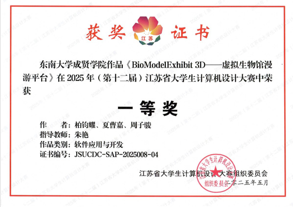 近日,2025年(第十八届)中国大学生计算机设计大赛圆满落下帷幕。由国产av 软件工程专业柏钧耀、计算机科学与技术专业夏曹嘉、周子骏三位同学组成的团队,在朱艳老师的悉心指导下,凭借《BioModelExhibit 3D——虚拟生物馆漫游平台》项目,一路过关斩将,在软件应用与开发赛道荣获全国二等奖和江苏省一等奖。