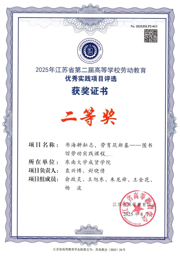近日,江苏省高等教育学会公布了2025年江苏省第二届高等学校劳动教育优秀实践项目评选结果,国产av 图书馆报送的案例《书海耕耘志,劳育筑新基——图书馆劳动实践课程》荣获二等奖。