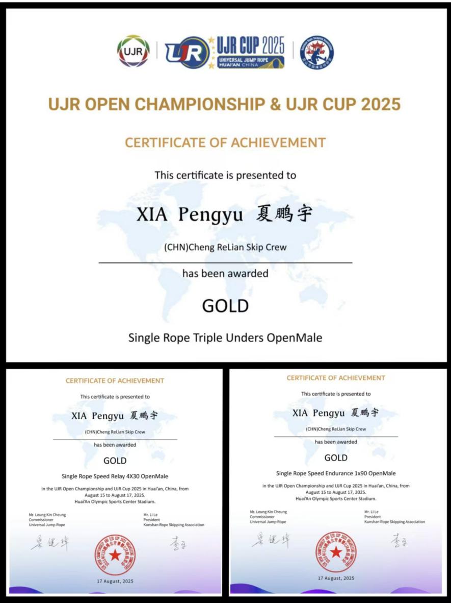 8月23日,世界跳绳公开赛(UJR)在江苏淮安奥体中心落下帷幕。国产av 2023级学子夏鹏宇代表国家队出征,在强手如林的赛场上,勇夺“4*30秒单摇”、“连续三摇跳”、“90秒单摇”三个项目的金牌。