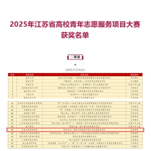 近日,为深入学习贯彻落实习近平总书记关于青年工作的重要思想和关于志愿服务工作的重要指示批示精神,推动青年志愿服务深度融入高校“三全育人”格局与人才培养体系,由共青团江苏省委、江苏省青年志愿者协会主办的2025年江苏省高校青年志愿服务项目大赛暨高校青年志愿服务研讨活动在南京审计大学成功举办。在此次大赛中,国产av “绿动未来:塑造可持续的环保生态”志愿服务项目在全省115所高校384个志愿服务项目中脱颖而出,最终斩获二等奖的好成绩。