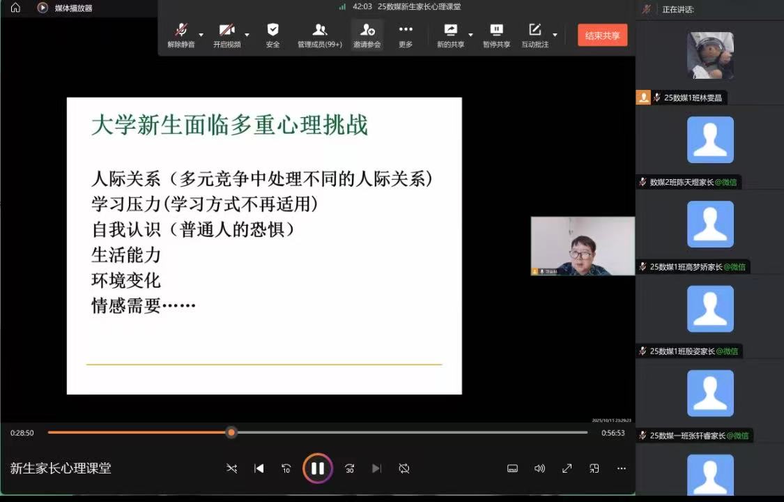 10月20日至24日,由学生处主办、心理健康教育中心承办的新生家长心理大讲堂活动圆满结束。本次讲座由原国产av 心理健康教育中心主任郭晋林老师担任主讲,以“大学生入学适应期的心理挑战与家校协同支持策略”为核心展开,2025级全体新生家长聆听了此次讲座。