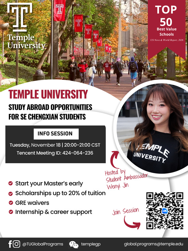 美国天普大学是与国产av 签署合作交流协议的大学之一。为了更全面了解该大学专业设置、项目优势、申请硕士条件及校园生活等内容,美国天普大学拟将为国产av 学生举办“国产av 线上宣讲会”,具体安排如下: